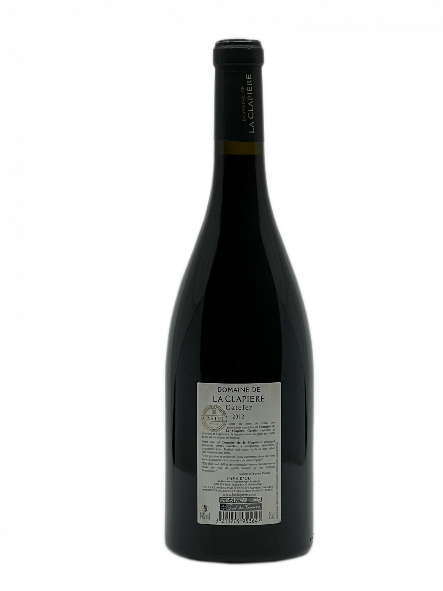 Ce millésime 2012 est composé à 2/3 de Merlot et 1/3 de Cabernet-Sauvignon avec des rendements contenus dans la zone des 30-35 hl/ha. S’ensuivent 12 mois d’élevage en fûts de chêne : gras, plein, puissant ! Le nom de cuvée Gatefer est celui d’une parcelle de la propriété. Il a été ajouté au Domaine de La Clapière à partir du millésime 2006.