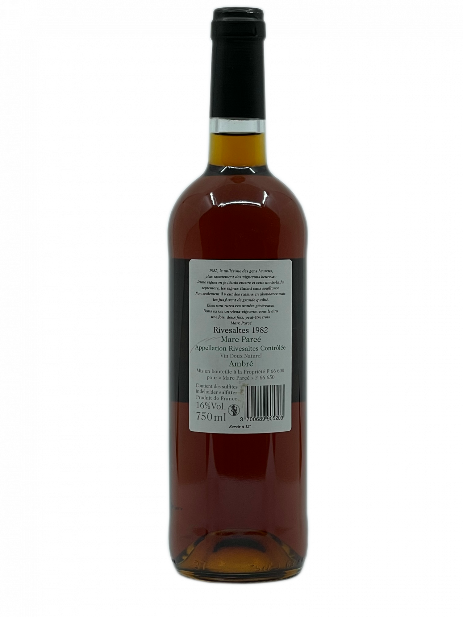Ce Rivesalte ambré provient du Grenache gris, blanc et de Macabeu. C’est un vin muté, c’est-à-dire qu’en cours de fermentation, de l’alcool vinique à 96° est ajouté au moût dans le but de stopper la fermentation et de conserver des sucres résiduels. Élevé 36 ans en barrique en milieu oxydatif, ce vin développe des arômes de torréfaction et de cacao qui lui donne un côté Rancio. C’est un vin riche qui conservent une grande finesse.